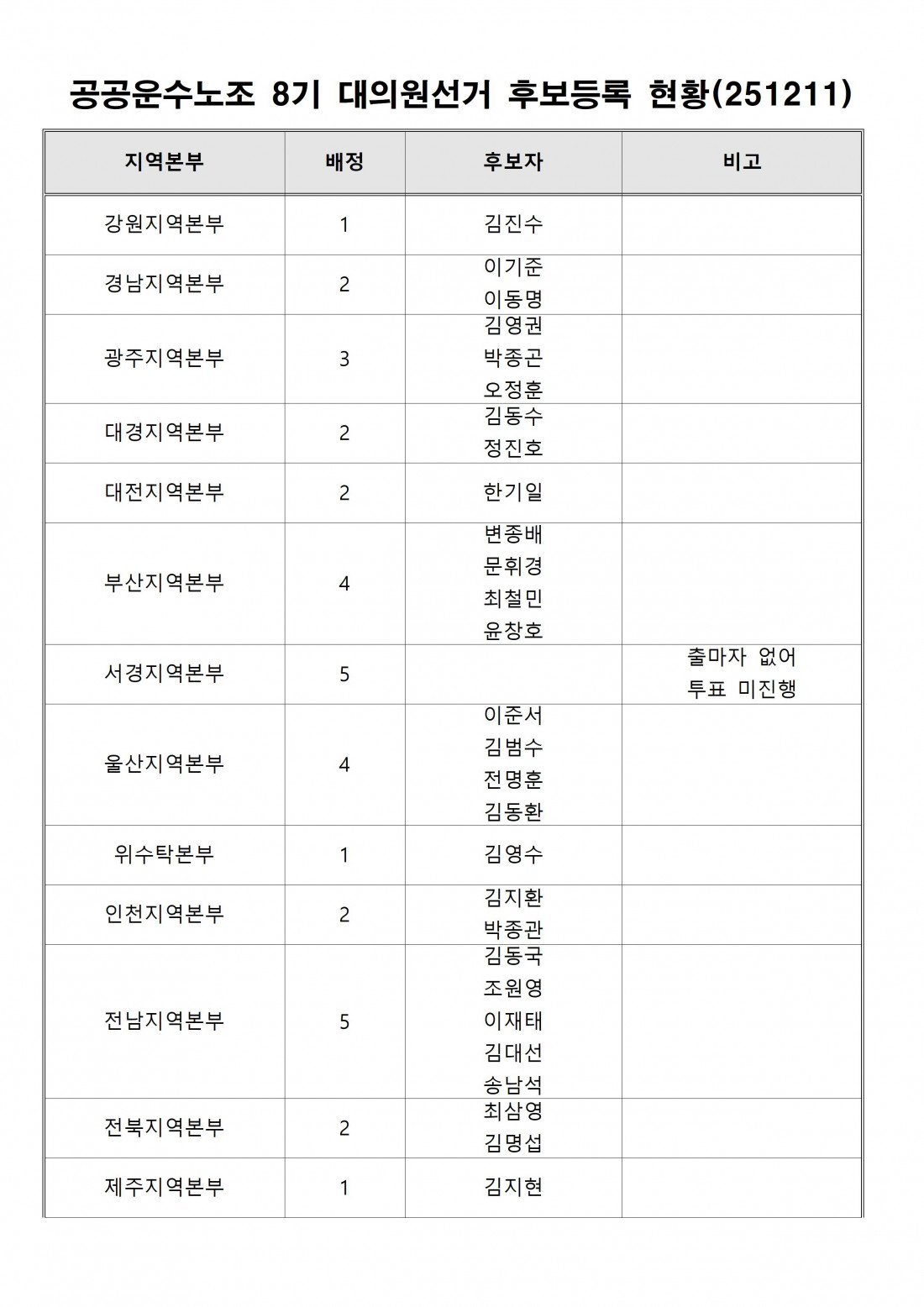 선거 공지사항 공공운수노조 8기 대의원 선거 등록 후보 안내 인쇄하기 목록 페이지 정보 작성자중앙선관위관리자 작성일25-12-11 18:00 조회수14 본문 2025년 12월 11일 18시 등록마감 현재공공운수노조 8기 대의원 선거에 등록한 후보자 안내입니다. 하단 표를 참조해주시기 바랍니다. 2025년 12월 11일화물연대본부 중앙선거관리위원회 다음글 다음글공공운수노조 8기 대의원(화물연대본부) 선거 공고 목록