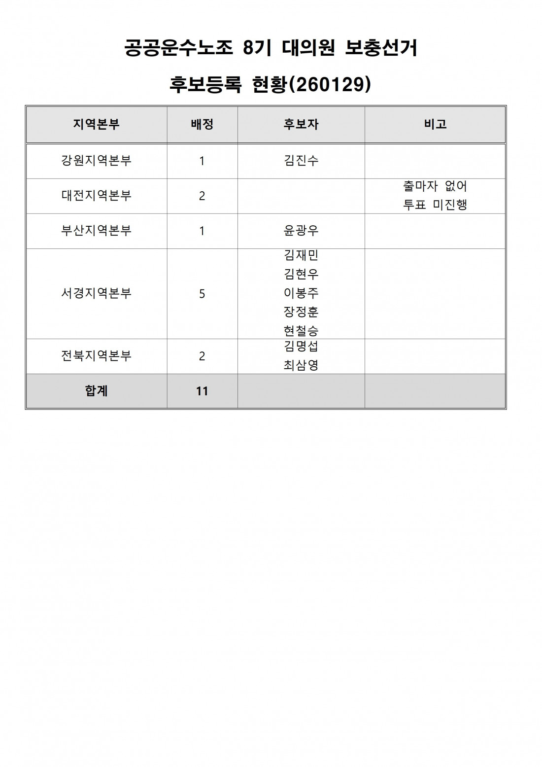 공공운수노조 8기 대의원 보충선거 등록 후보 안내