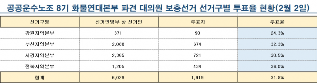 선거 공지사항 공공운수노조 8기 대의원 보충선거 투표율 현황(260202) 인쇄하기 목록 페이지 정보 작성자중앙선관위관리자 작성일26-02-03 08:54 조회수22 본문 2026년 2월 2일 18시 현재 이전글 이전글공공운수노조 8기 대의원 보충선거 투표율 현황(260203) 다음글 다음글공공운수노조 8기 대의원 보충선거 등록 후보 안내 목록
