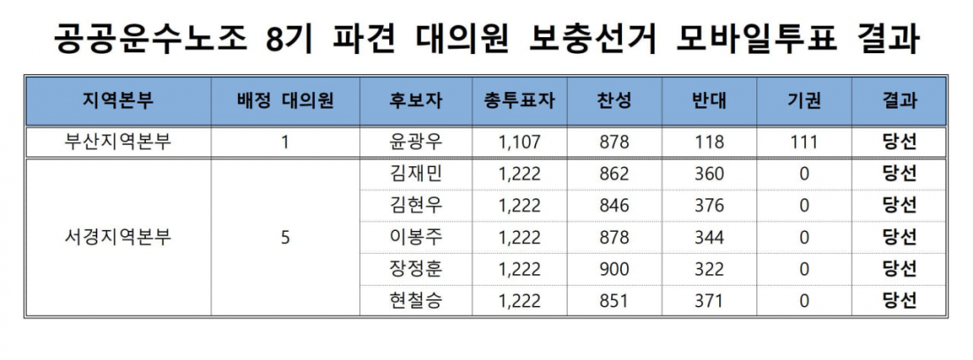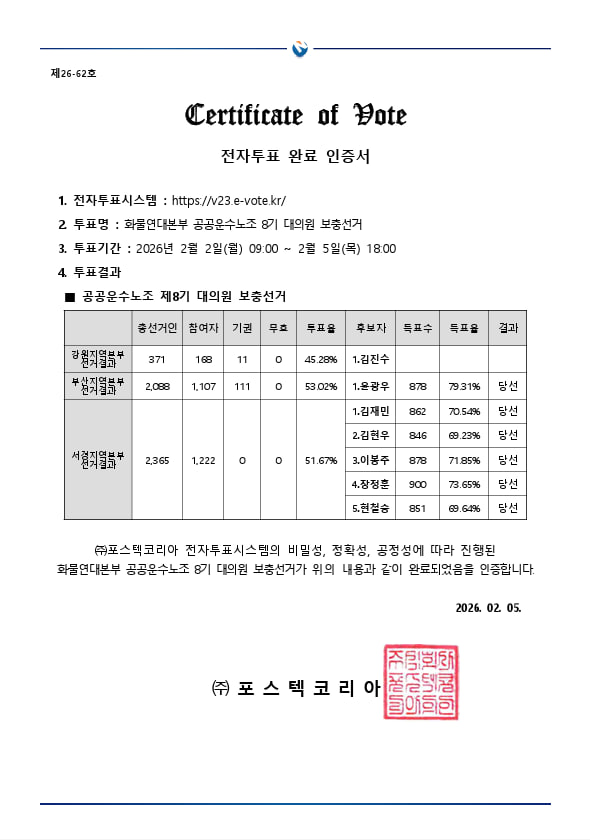 선거 공지사항 공공운수노조 8기 대의원 보충선거 연장투표결과 인쇄하기 목록 페이지 정보 작성자중앙선관위관리자 작성일26-02-05 17:07 조회수368 본문 이전글 이전글공공운수노조 8기 대의원 보충선거 당선인 확정 공고(02.12.) 다음글 다음글공공운수노조 8기 대의원 보충선거 투표결과 목록