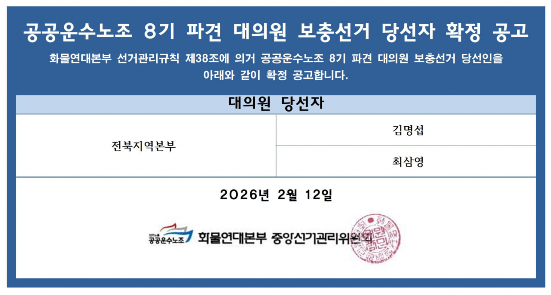 선거 공지사항 공공운수노조 8기 대의원 보충선거 당선인 확정 공고(02.12.) 인쇄하기 목록 페이지 정보 작성자중앙선관위관리자 작성일26-02-12 10:50 조회수135 본문 다음글 다음글공공운수노조 8기 대의원 보충선거 연장투표결과 목록