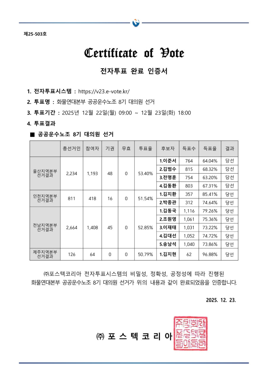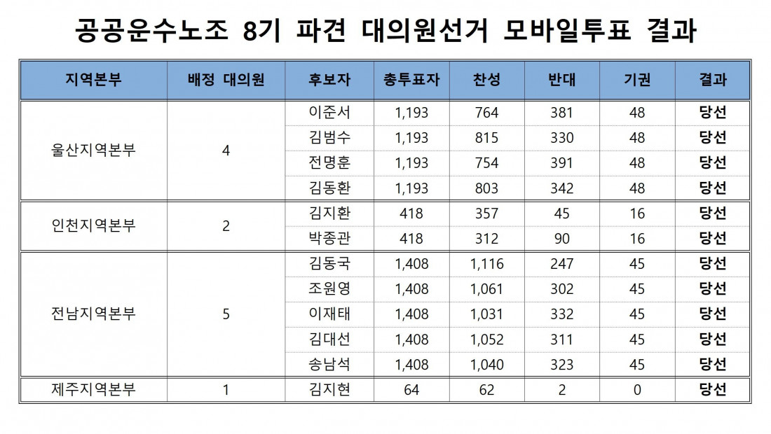 선거 공지사항 공공운수노조 8기 대의원 선거 투표결과 인쇄하기 목록 페이지 정보 작성자중앙선관위관리자 작성일25-12-23 10:17 조회수333 본문 이전글 이전글공공운수노조 8기 대의원(화물연대본부) 보충선거 공고 목록